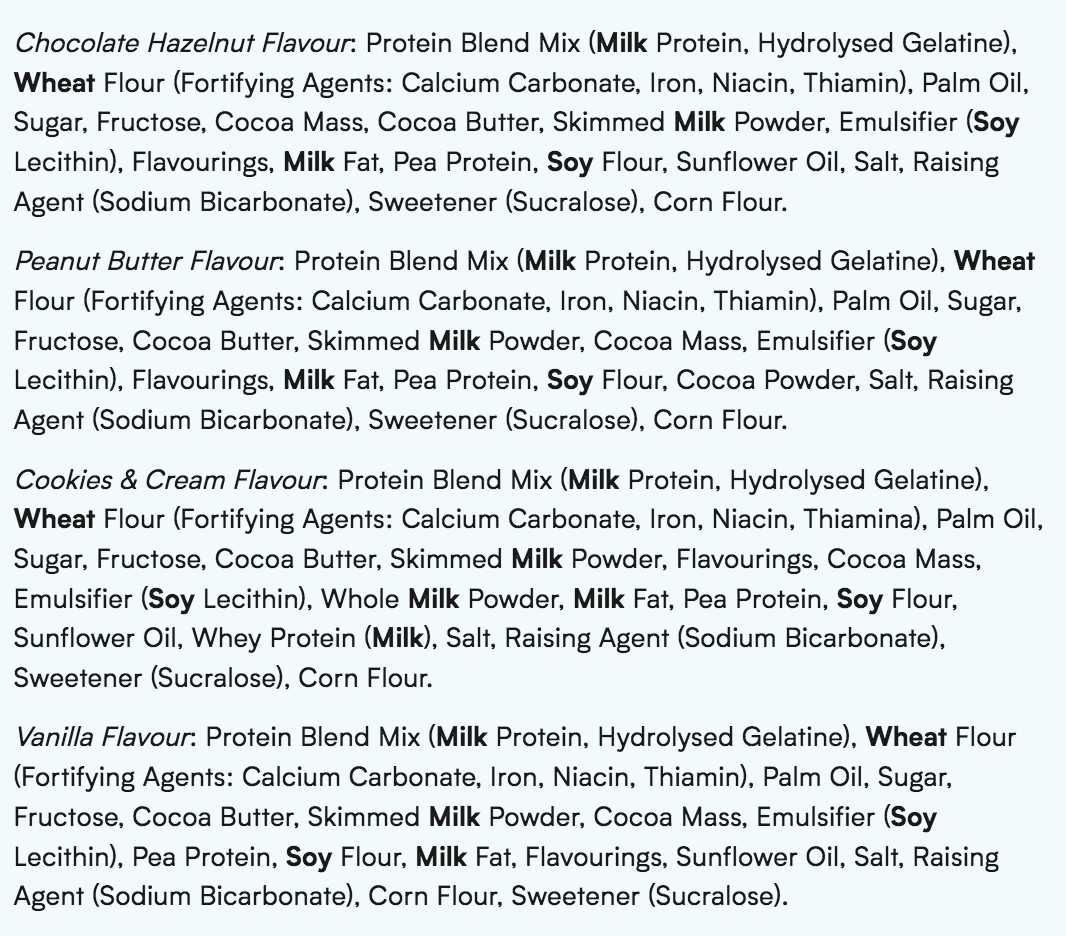 Ingredients: eanut Butter Flavour: Protein Blend (39%) (Milk Protein, Hydrolysed Bovine Gelatine), Wheat Flour (Wheat Flour, Calcium Carbonate, Iron, Niacin, Thiamin), Palm Oil, Sugar, Fructose, Cocoa Butter, Skimmed Milk Powder, Cocoa Mass, Flavourings, Emulsifier (Soya Lecithin), Milk Fat, Pea Protein, Soya Flour, Sunflower Oil, Salt, Cocoa Powder, Raising Agent (Sodium Bicarbonate), Cornflour. MILK CHOCOLATE COATING: Cocoa Solids 30% Minimum. Milk Solids 16% Minimum.