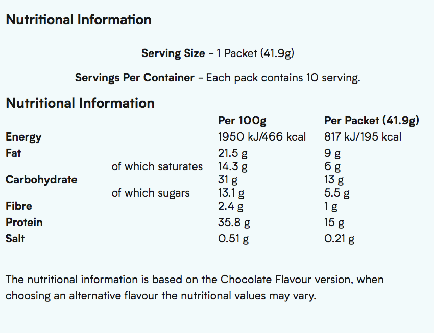 Nutritional information for chocolate packet, including calories and macronutrients per serving.