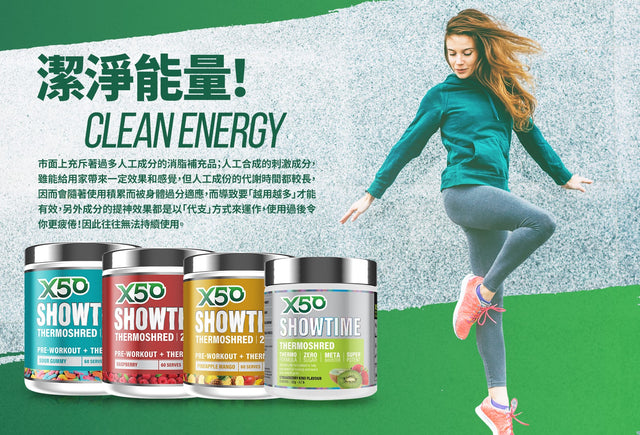 成分完全公開透明標示,X50 Showtime用最新技術提煉並且重新組合高達11種高效草本消脂成分,份量達到有效而適當的水平,從根本改善體質及提升新陳代謝,激發身體的消脂能力,天然能量成分亦有助維持運動訓練強度。