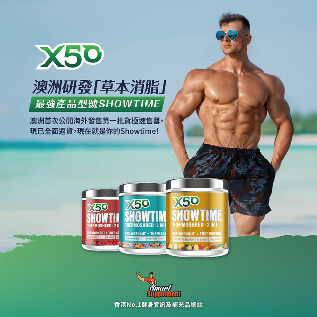 X50 Showtime效果自然持久、穩定減脂,能夠避免減重消脂期間常見的「反彈」,並且維持肌肉線條,剛剛新出品已經得到澳洲健身界極佳的反饋,被譽為「草本消脂」補充品新一代的標準。不含糖份而且零熱量。